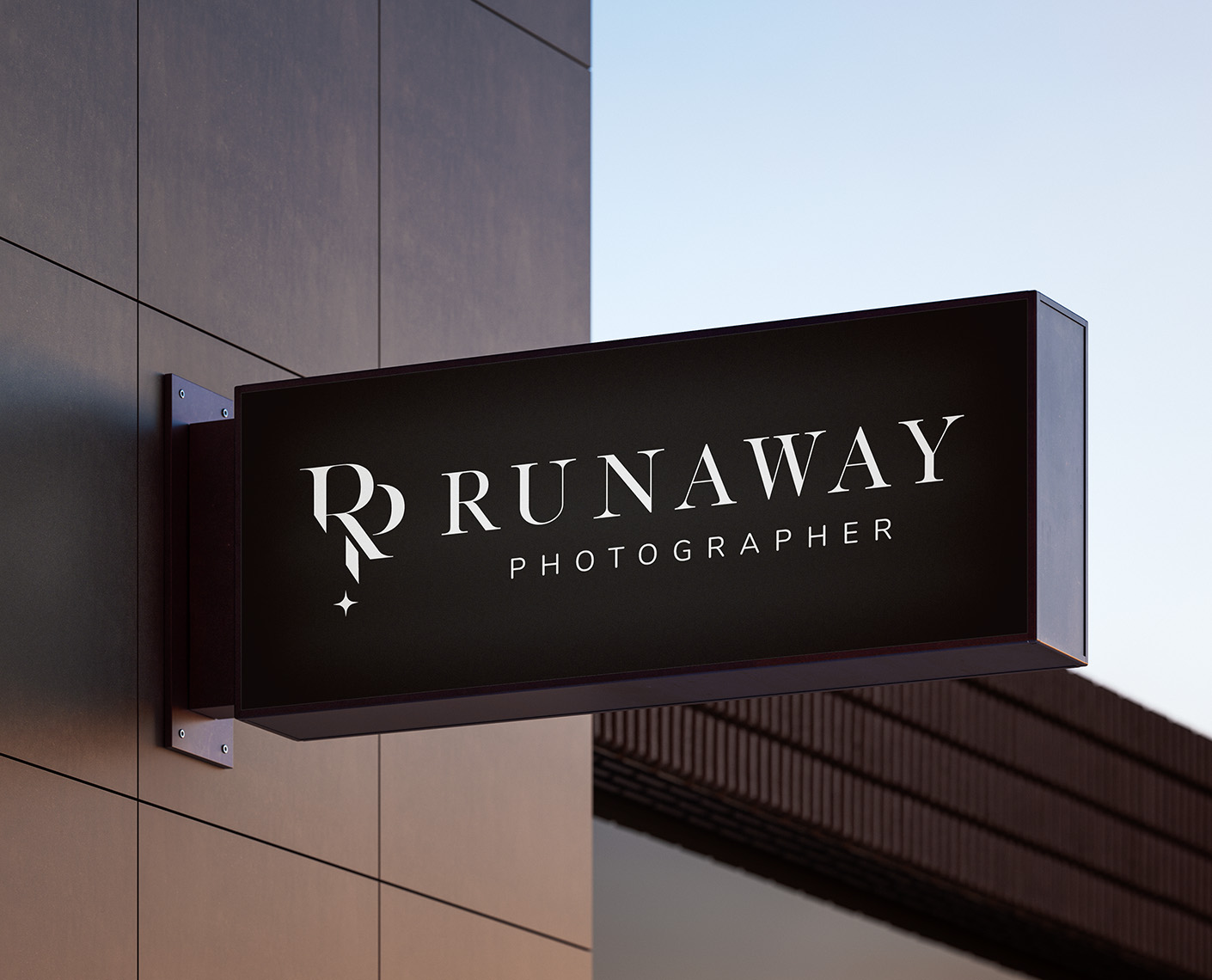 The primary logo is a stylized "RP" monogram with intertwined letters and a subtle star element, representing "Runaway Photographer." The full wordmark uses elegant serif typography in white or black. Variations include: