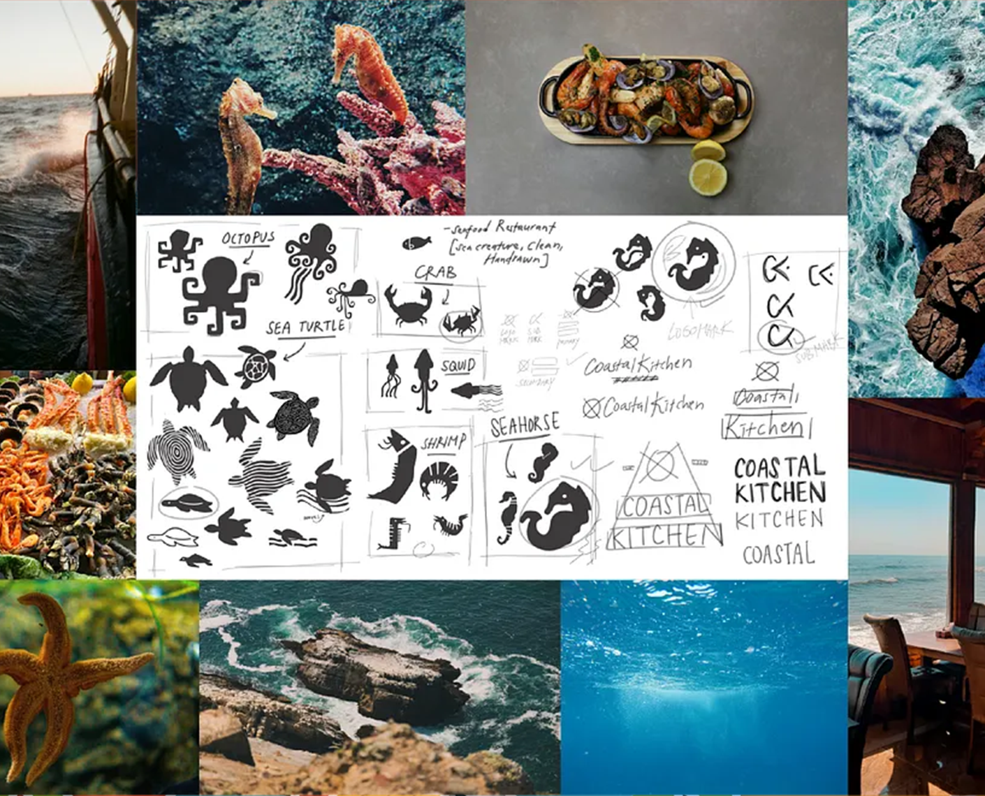 I began with in-depth research to immerse myself in the brand's world. This included visiting the restaurant to experience its ambiance, menu, and customer interactions firsthand. I analyzed competitor brands in the seafood and coastal dining space, noting common tropes like anchors or waves, and identified opportunities to differentiate with more organic, creature-inspired motifs.
